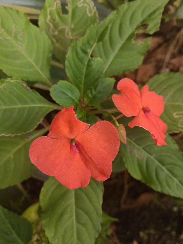 Two vibrant orange flowers are the focal point, surrounded by lush green leaves. The leaves exhibit various textures and shapes, some with jagged edges and insect damage. The flower petals are smooth, with a slight sheen. One flower faces forward, revealing a small, darker center. The other flower is slightly angled, showcasing its delicate structure. The background is a mix of brown soil and scattered foliage.