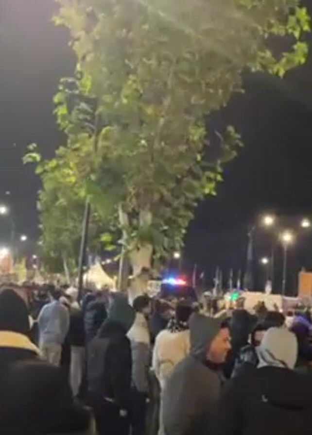 large crowd of people gathered outdoors at night. The scene is illuminated by streetlights. There are trees lining the area where the crowd is gathered. Some people in the crowd are wearing hoodies and winter coats. The crowd appears to be dense and there are many people walking in different directions. Some individuals are standing on tree branches.