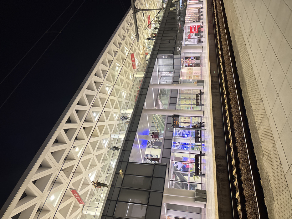 A modern train station with a striking architectural design. A white, triangular patterned facade dominates the view, contrasting with the dark sky. Inside, glass walls reveal waiting areas with benches and people. Retail spaces are visible on the upper level. Train tracks run parallel to the platform, which is paved with light-colored tiles. The scene is brightly lit, creating a clean and contemporary atmosphere.