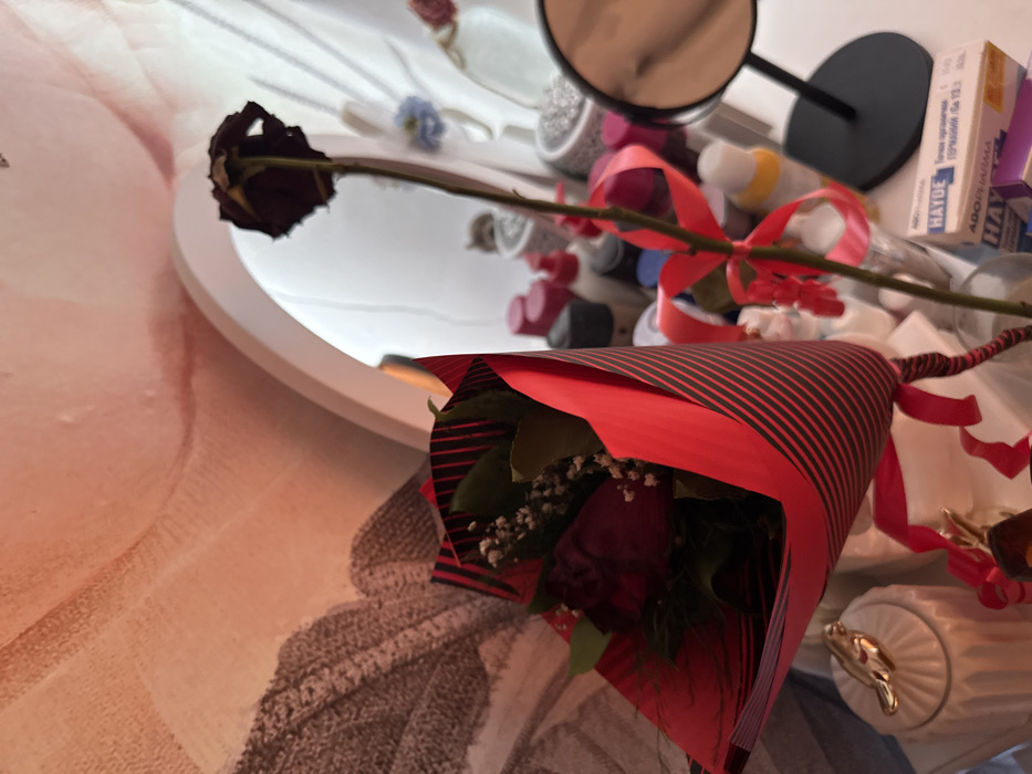 The scene depicts an indoor environment in the city of Kozloduy, Bulgaria, likely a personal dressing area or vanity. In the foreground-left, a conical bouquet wrapped in red paper with black stripes is visible, containing a dark red rose, white filler flowers, and green foliage, secured with a red ribbon. Directly below the bouquet, a white, ribbed ceramic container topped with a gold bird figurine is partially visible. To the right, a single dark, dried rose stem, tied with a red ribbon, stands upright. Adjacent to it on the right is a small, circular mirror with a black stand. The background shows a cluttered surface filled with numerous bottles and containers, predominantly in red, white, and pink. Among these items, a white rectangular box labeled "HAYDE" with Cyrillic text and "ADOPHARMA" is clearly discernible. An archway in the distant background frames a brightly lit area, and the upper left background features a wall with an abstract pattern in earthy tones. No individuals are present in the image.