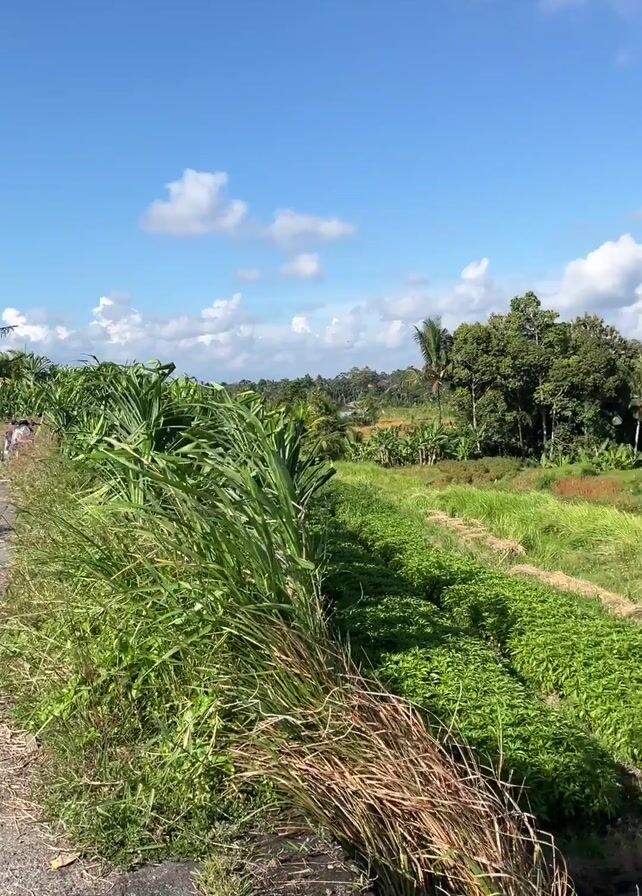 The camera pans across a green landscape with a concrete path on the left side. The path is surrounded by lush vegetation, including tall grass and various plants. In the distance, there are fields with crops and trees dotting the horizon. The sky is blue with scattered white clouds, creating a bright and sunny atmosphere. As the camera moves, it reveals a small house with a red roof nestled among the trees in the distance. The scene evokes a sense of tranquility and natural beauty.