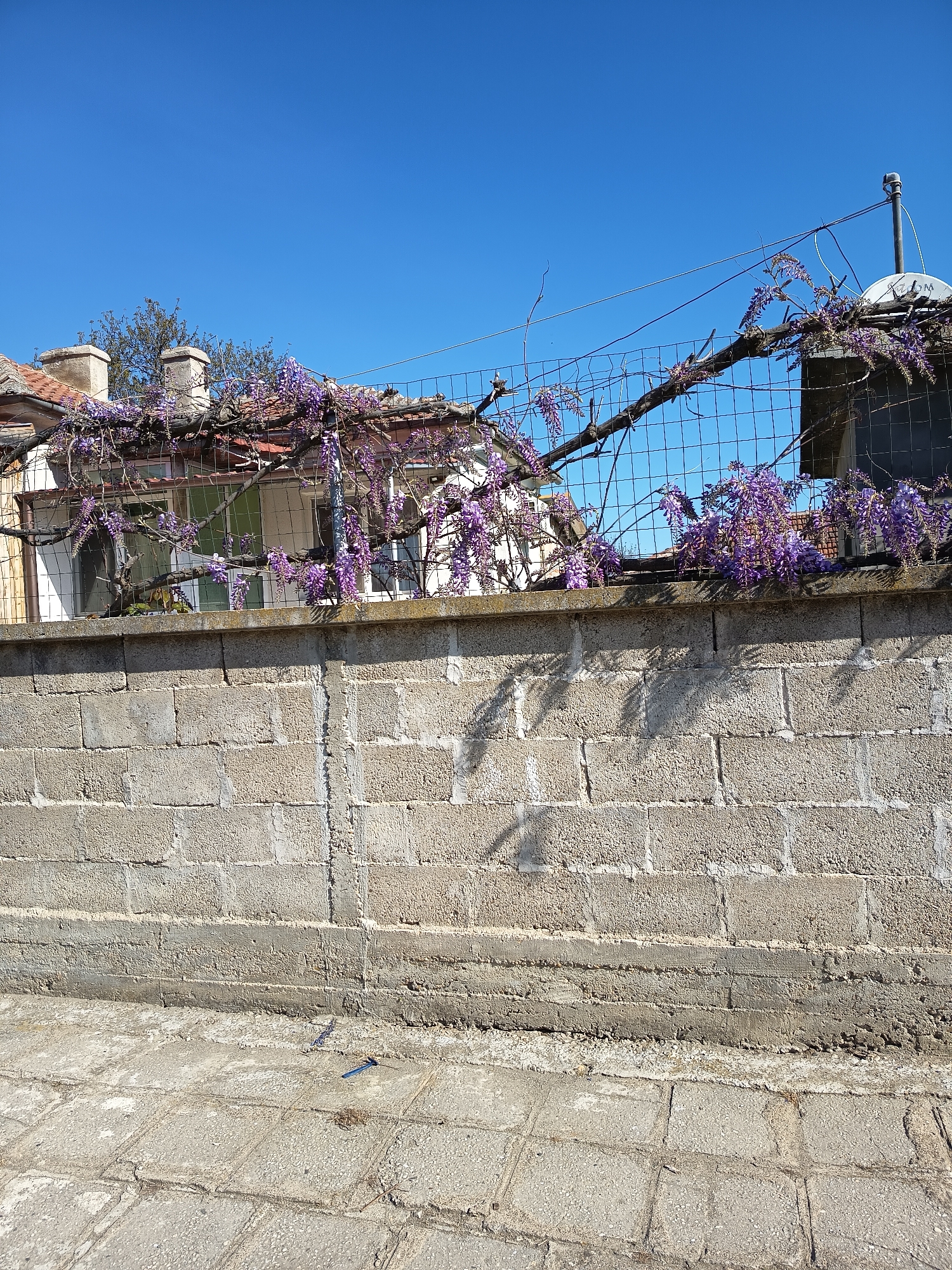 concrete block wall topped with a wire fence in Sungurlare, Bulgaria. Purple wisteria vines grow along the fence. Behind the fence, parts of a house with a tiled roof and white walls are visible. The sky is clear blue. On the ground, the paving stones are visible. There are two blue pens or pencils on the ground.