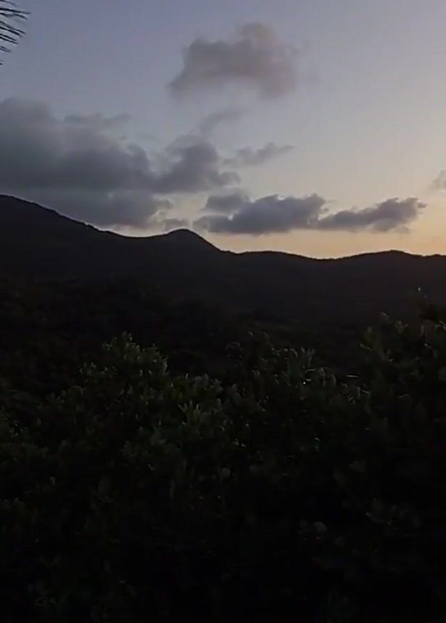 scenic landscape at dawn or dusk, featuring rolling hills and lush greenery in the foreground. The sky transitions from dark to light with hints of a colorful sunrise or sunset. Clouds are scattered across the sky. The camera slowly pans across the landscape, revealing a beautiful horizon. Some buildings and structures are visible in the distance. The overall impression is one of tranquility and natural beauty.