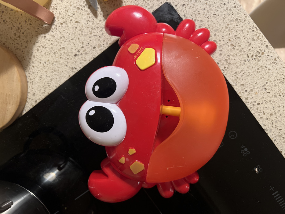 A red plastic toy resembling a crab sits on a black stovetop. It has large, googly eyes, and yellow buttons, one labeled "ON/OFF". The toy's left claw is closed, while the right is a translucent orange semicircle with a yellow rod inside. The stovetop is partially covered with a speckled countertop.