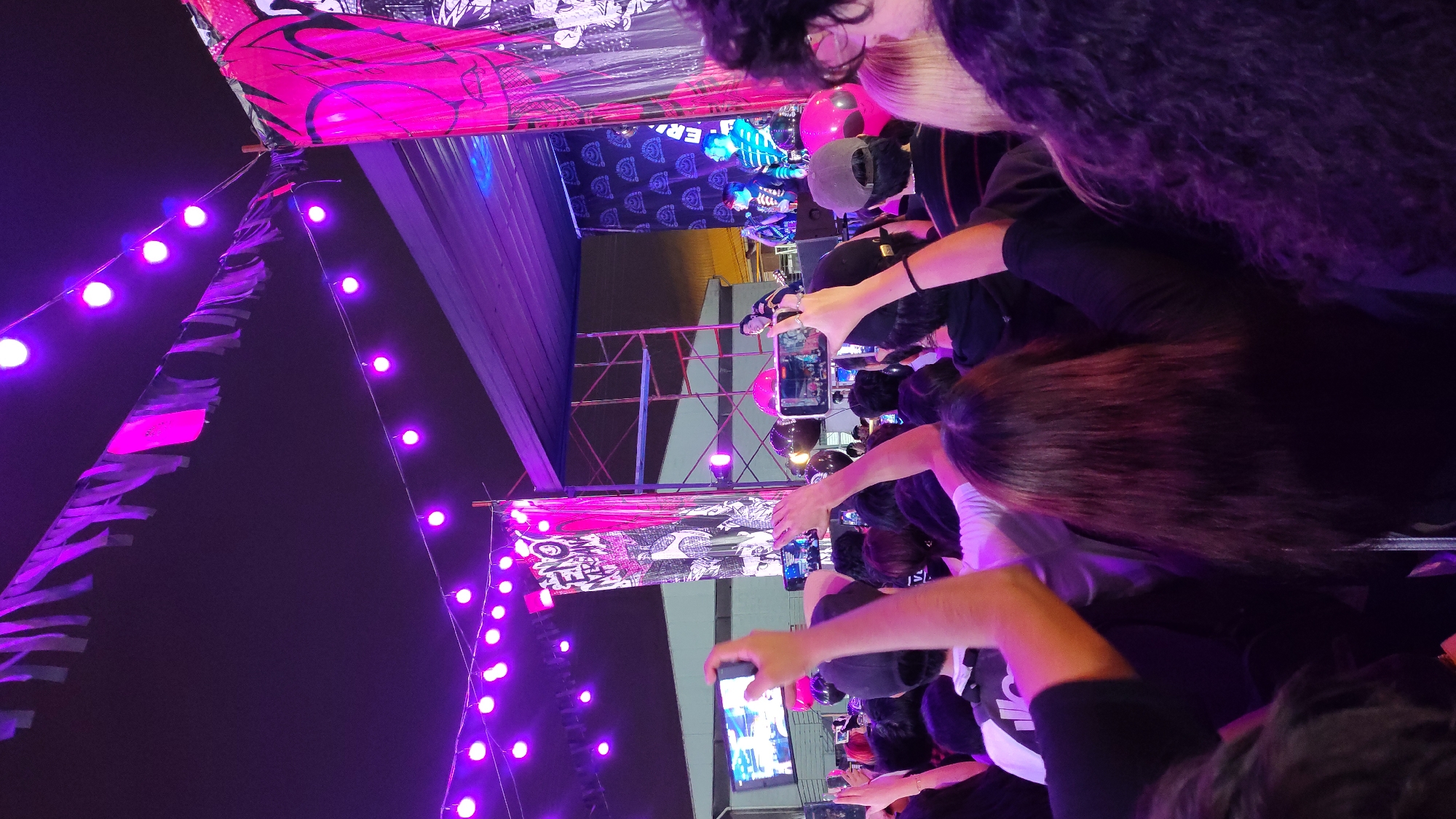 crowd of people in San Borja, Peru, at a nighttime event, possibly a concert or performance. Many people are holding up their smartphones to record or photograph the stage. The stage itself is decorated with banners and lights, primarily in shades of pink and purple. The crowd appears dense, with people closely packed together. The environment is dark, with the main illumination coming from the stage lighting and strings of purple lights hanging above the audience.