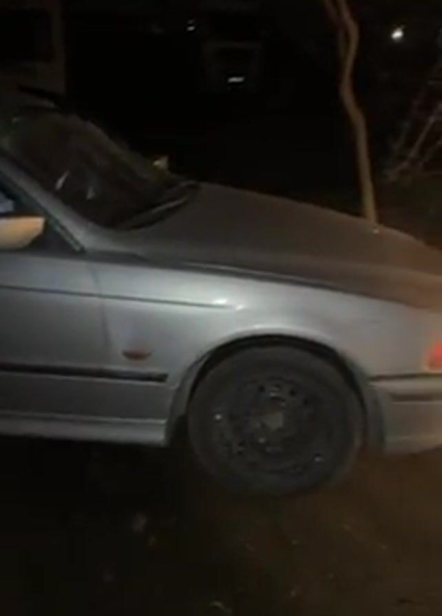 silver sedan parked outside at night. The car is facing left and the front right tire is visible. The camera pans across the side of the car and then to the front, revealing the car’s license plate number: CT 4044 PT. A building is visible in the background.