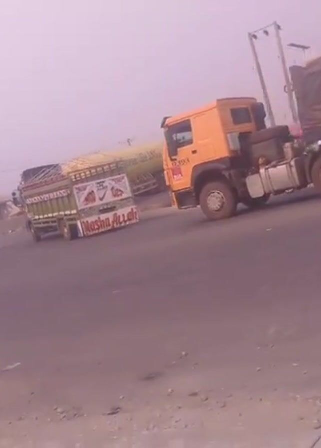 three large trucks on a paved road. One truck is green and decorated, another is orange with a covered trailer, and the third is gray with a dark gray container. People are visible near the orange truck. The sky is overcast, and there are buildings and power lines in the background. The road appears to be slightly dusty.