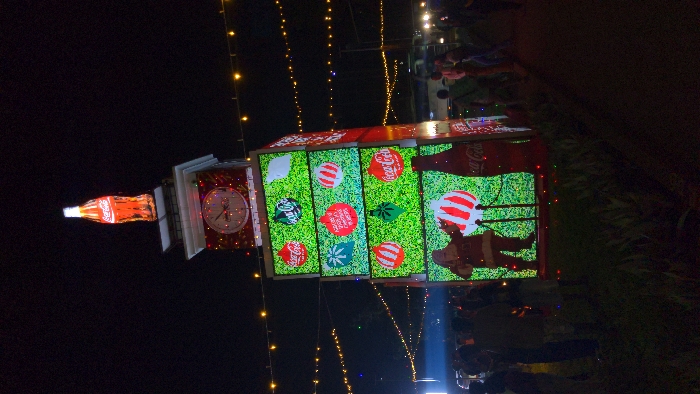 A lit Coca-Cola bottle sits atop a clock-like tower displaying a large clock face. The tower is adorned with Christmas-themed imagery. Large screens show Christmas ornaments and Coca-Cola logos. Below the tower, people are gathered. Strings of lights are suspended overhead. The scene is illuminated at night, with a dark background.