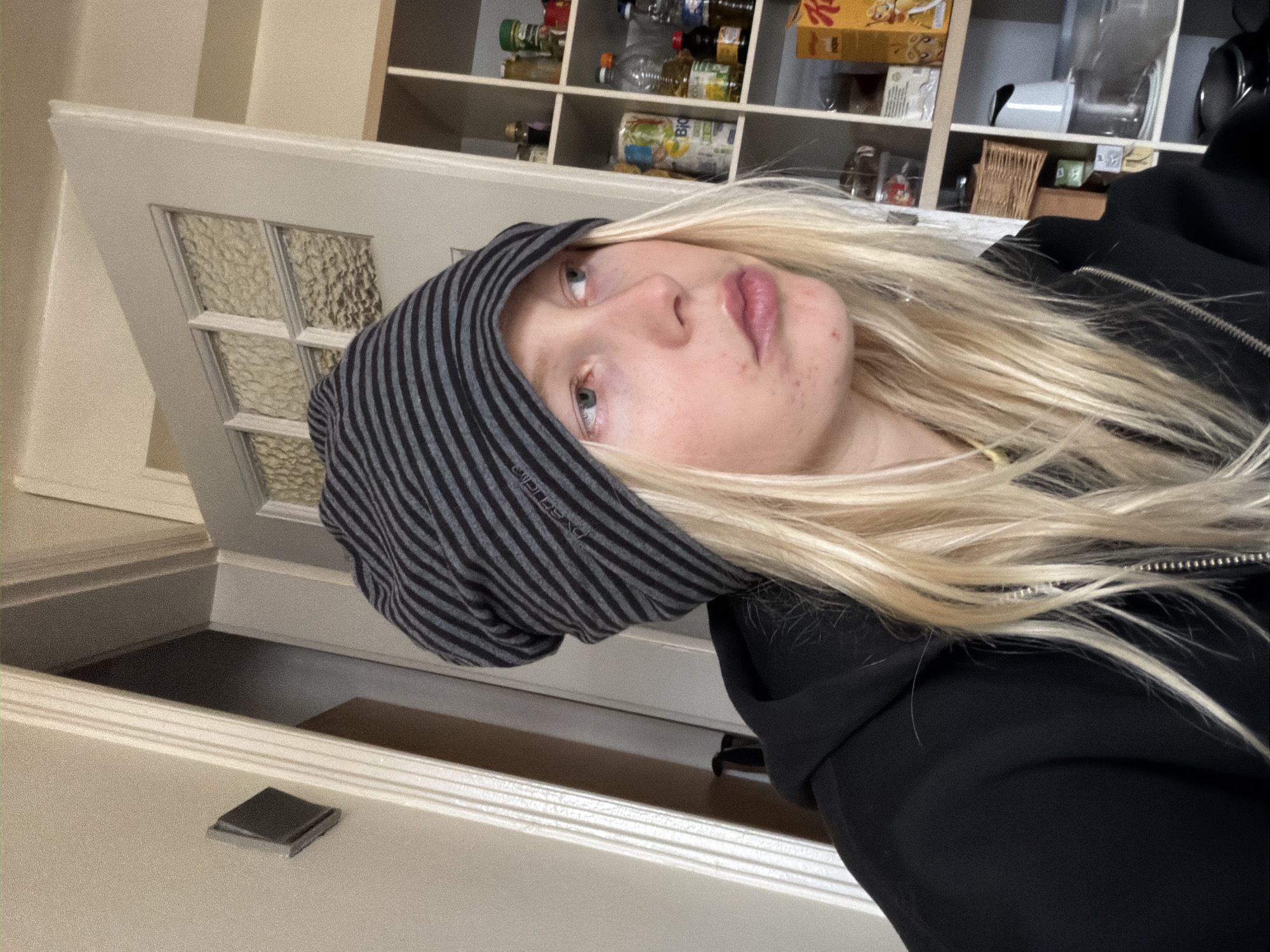 A close-up, slightly angled photograph shows a person with fair skin and blonde hair wearing a striped grey and black beanie and a black zippered jacket. The person's face is partially obscured by the beanie, with the left eye and part of the forehead covered. The background is a blurred domestic scene with shelves filled with various food items and containers. A white door with glass panels is visible on the left side. A dark object sits on a white surface in the lower left corner. The photo does not contain identifiable information about the city of Strasbourg, France.