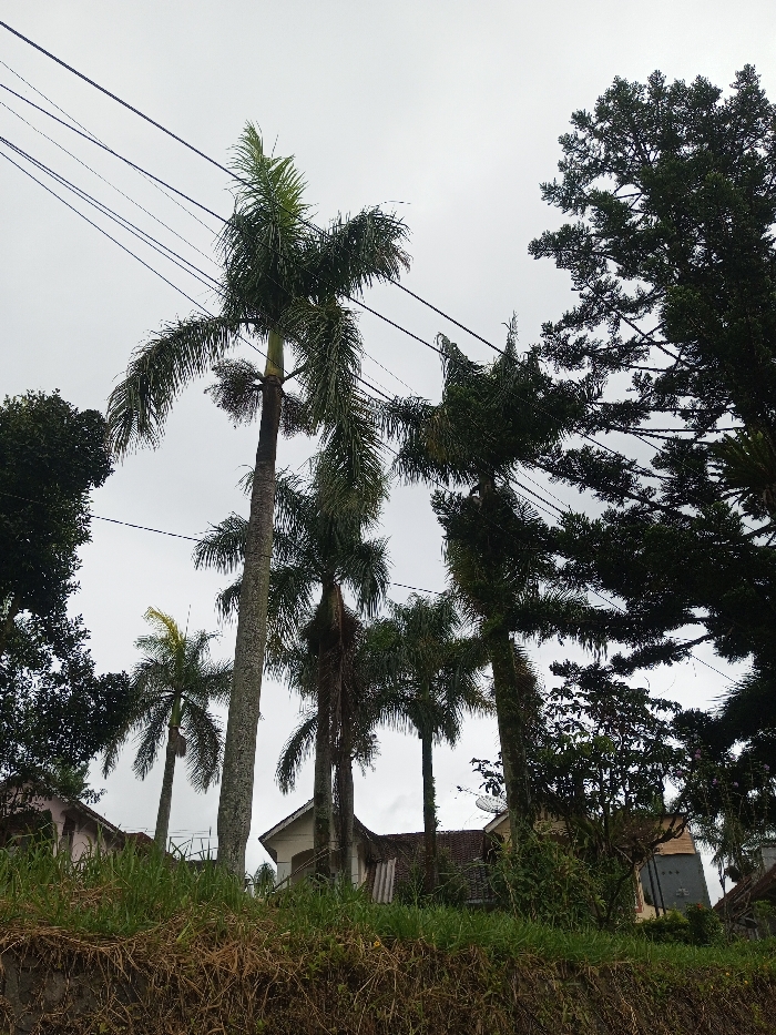 Several tall, slender palm trees punctuate a skyline overcast with gray skies. Power lines stretch across the upper portion of the scene, intersecting the trees. A large evergreen stands to the right. Houses with dark roofs are nestled amongst the foliage, partially obscured by a grassy bank in the foreground. The overall mood is muted due to the diffused light and subdued colors.