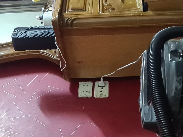 The image depicts an indoor scene within a residence located in At-Tall, Syria. A reddish-burgundy wall, patterned with short, angled white linear strokes, dominates the left and central portions of the frame. Two white electrical outlets are vertically mounted on this wall; a white power adapter is plugged into the lower outlet, from which a white cable extends downwards and to the right. To the right, a light-brown wooden dresser or cabinet with decorative carvings along its upper edge is visible. A mirror with a matching carved wooden frame rests on or is attached to the dresser, reflecting a lighter, indistinct background. A black, rectangular electronic device, possibly a speaker or small computer, featuring a textured front grille, sits on the dresser's surface to the left of the mirror. A separate white cable originates from this device and runs horizontally across the dresser top towards the left, then descends out of view. Other indistinct objects, including a white cylindrical container, are partially visible on the dresser. In the lower left foreground, the upper section of a dark grey vacuum cleaner is present, with a black corrugated hose draped across its top surface. The white cable from the wall outlet runs in the direction of the vacuum cleaner. No individuals are present in the image.