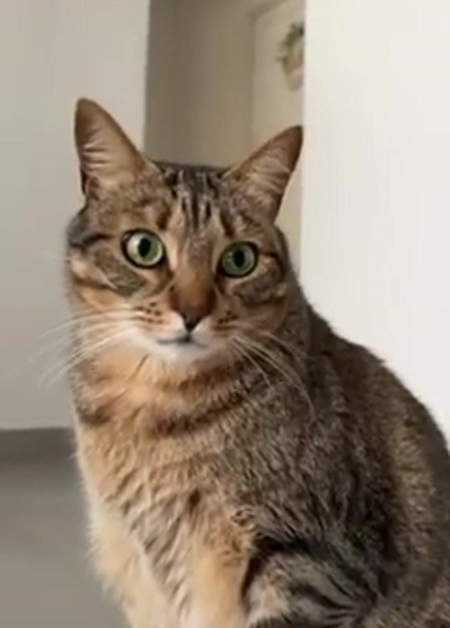 brown tabby cat with green eyes sitting indoors. The cat looks straight ahead, then appears to move forward towards the camera, ending with a blurred close-up of its face. The background is a white wall and a doorway.