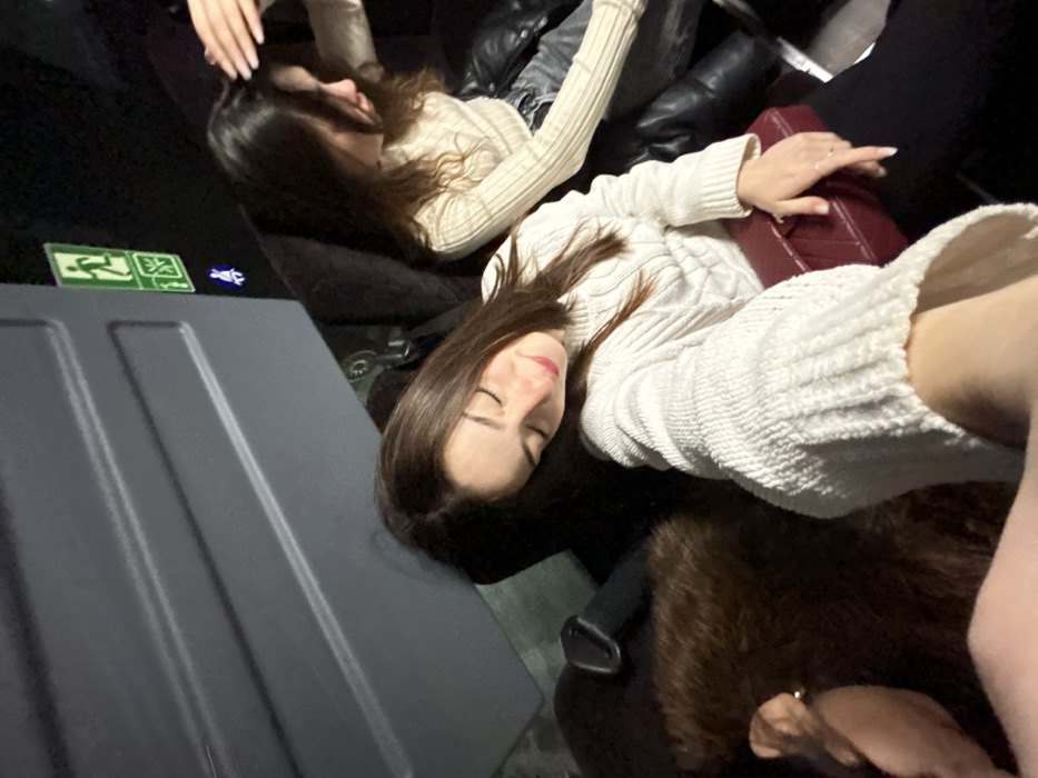 Two women are reclining on a dark surface, possibly seats. Both wear light-colored, textured sweaters. One woman lies atop a burgundy purse. The first woman has long brown hair and closed eyes. A dark brown, possibly fur, item is next to her. A grey panel is in the bottom left with emergency exit signs visible. A second woman is further back, with dark leather-like pants visible. The image has a slightly tilted perspective.
