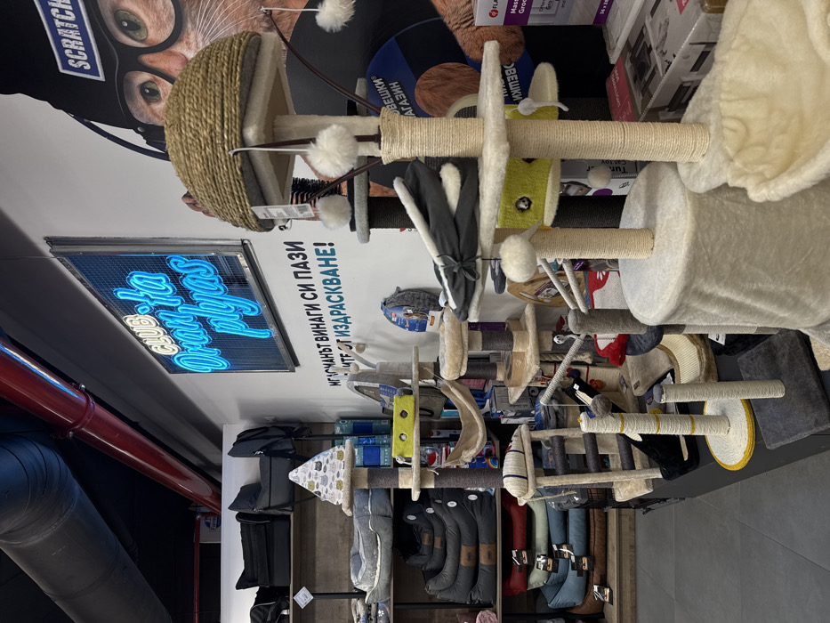This image displays the interior of a pet store, specifically a section dedicated to feline products, located in Sofia, Bulgaria