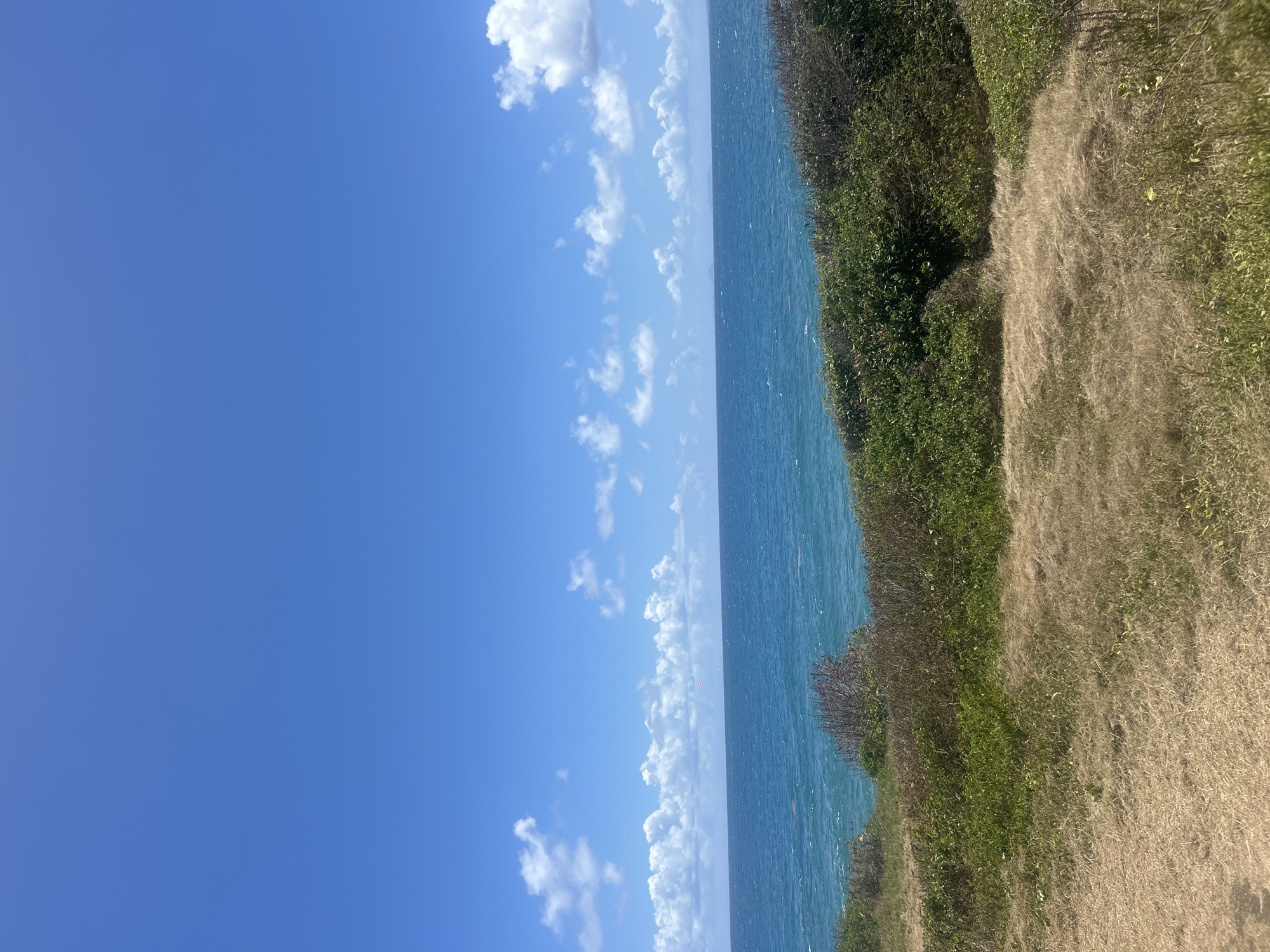 The image displays a coastal landscape in Le Gosier, France, under a clear blue sky with scattered white cumulus clouds. The upper half of the frame shows the sky, while the lower half presents the open ocean with blue-green water and visible waves. A faint landmass is discernible on the distant horizon, slightly right of center. The immediate foreground consists of a sloping area of dry, light brown grass and dirt, transitioning into dense, green scrub brush and bushes that extend towards the sea. No individuals or specific objects are present. Several small, indistinct reddish-pink points are visible on the distant ocean surface.
