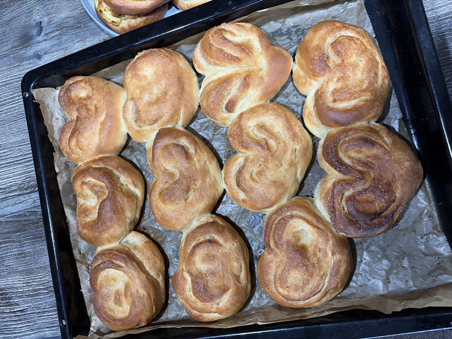 - "The image displays a top-down view of a black rectangular baking tray containing eleven freshly baked sweet buns" by FM-rbhEP2, licensed under CC BY 4.0