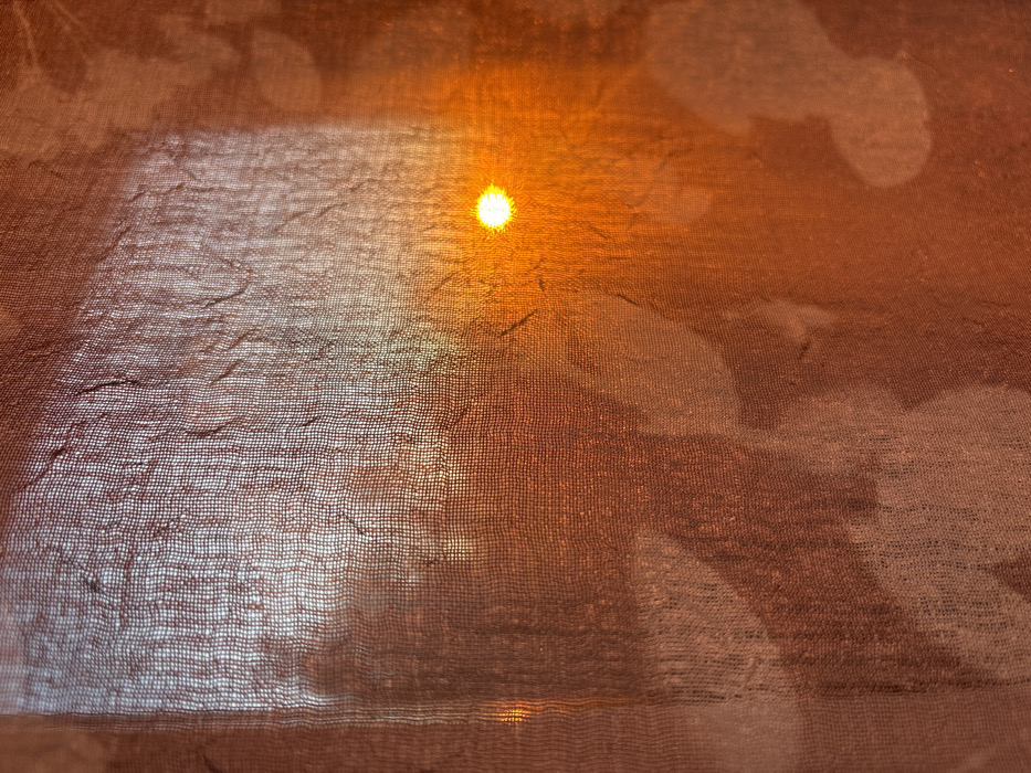 The scene is set in Kunje, Montenegro. The image depicts a close-up, vertically oriented view of an orange-brown, translucent woven fabric, functioning as a curtain or screen. Intense, warm, orange-hued light permeates the fabric from behind and to the right, indicative of direct sunlight. A distinct, bright white circular light source, consistent with the sun, is visible through the fabric in the lower-right quadrant of the frame. The fabric displays a fine mesh weave with subtle wrinkles and folds throughout its surface. Irregular, lighter-toned, abstract patterns are present across the fabric, suggesting either inherent design within the material, variations in light transmission, or external shadows. No individuals or specific actions are depicted. The environment is implied as an interior space with a window or opening to an exterior light source.