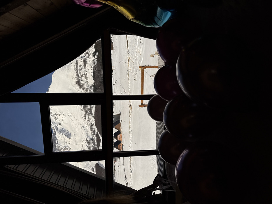The image depicts a view from a dimly lit interior, looking out through a multi-pane window onto a snow-covered landscape in the city of Motički gaj, Montenegro. In the immediate foreground, within the interior, numerous dark, rounded balloons occupy the lower portion of the frame. To the far left, the silhouette of a person's left shoulder and arm, clad in dark attire, is partially visible. To the far right, a large, reflective foil balloon, exhibiting purple, gold, and blue hues, is partially visible. The window frames a bright exterior scene. In the midground, a vast expanse of snow covers the terrain. Three distinctive, dark-roofed A-frame wooden cabins are visible horizontally across the mid-distance. Further right in the midground, a wooden archway-like structure stands in the snow. The background is dominated by large, snow-covered mountains with visible rock formations and sparse trees. The sky above is clear and blue. The interior is significantly darker than the brightly illuminated exterior, creating a strong contrast.