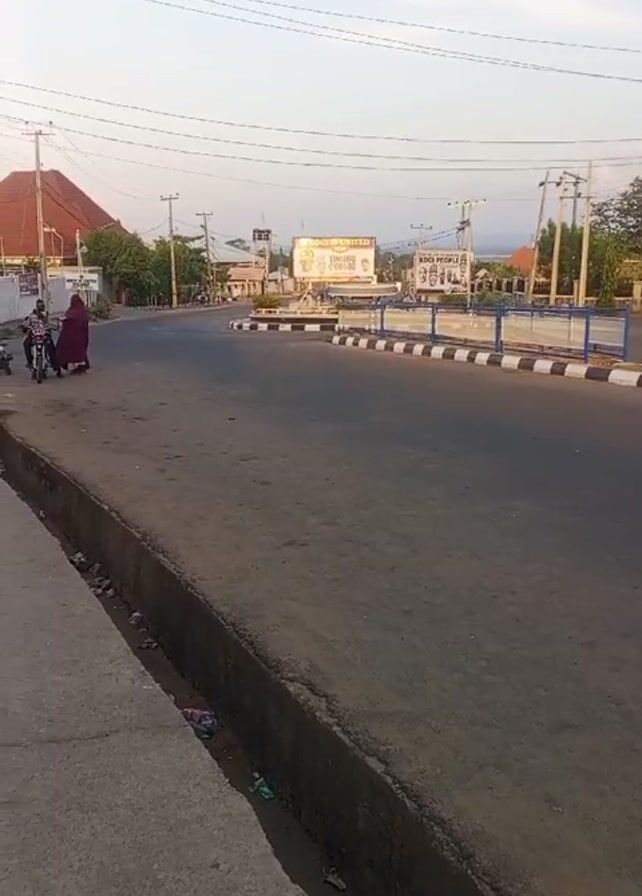 The video depicts a street scene in a town. In the foreground, there is a concrete curb with a drainage ditch alongside the road, containing some debris. The road stretches ahead, appearing empty except for a motorcycle with two people near the left side of the frame. One person is on the motorcycle, and the other is standing beside it wearing a dark red robe. Across the street, there is a roundabout with black and white striped barriers and blue railings. Billboards are placed in the center of the roundabout. In the background, there are buildings, utility poles, and a light blue sky with some clouds.
