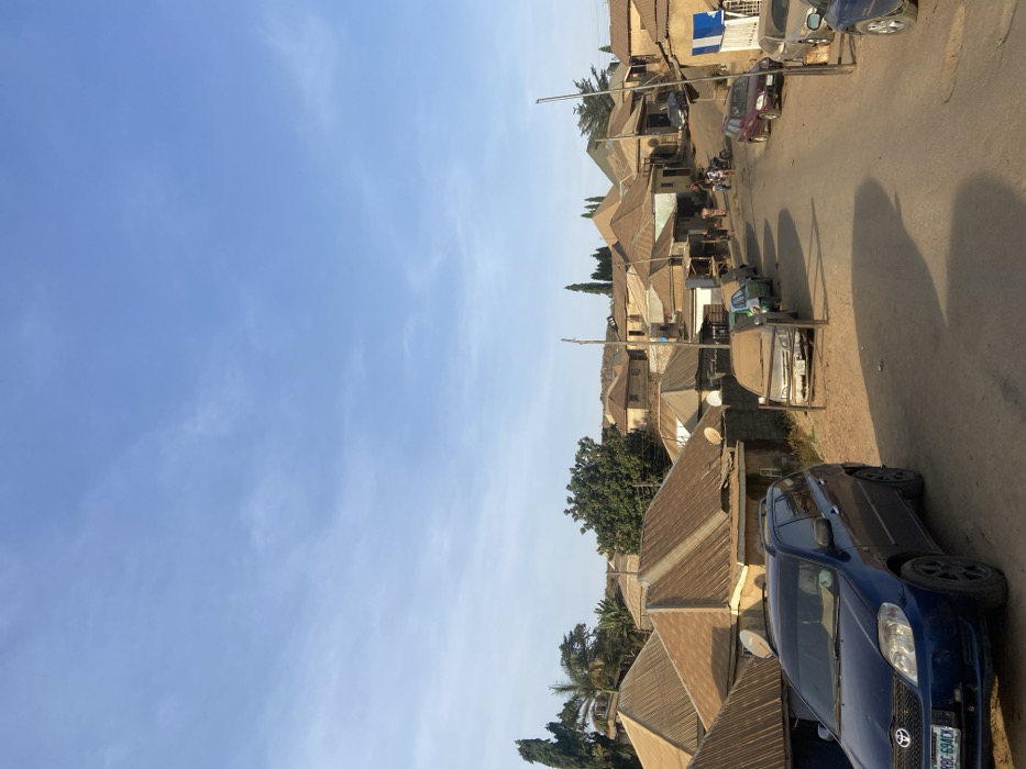 A street scene captures a neighborhood with houses featuring corrugated metal roofs. A blue car sits parked on the right side of the road. Further down the street, several vehicles, including cars and what appears to be a motorcycle, are visible. Shadows stretch across the pavement. The sky is a clear, pale blue.