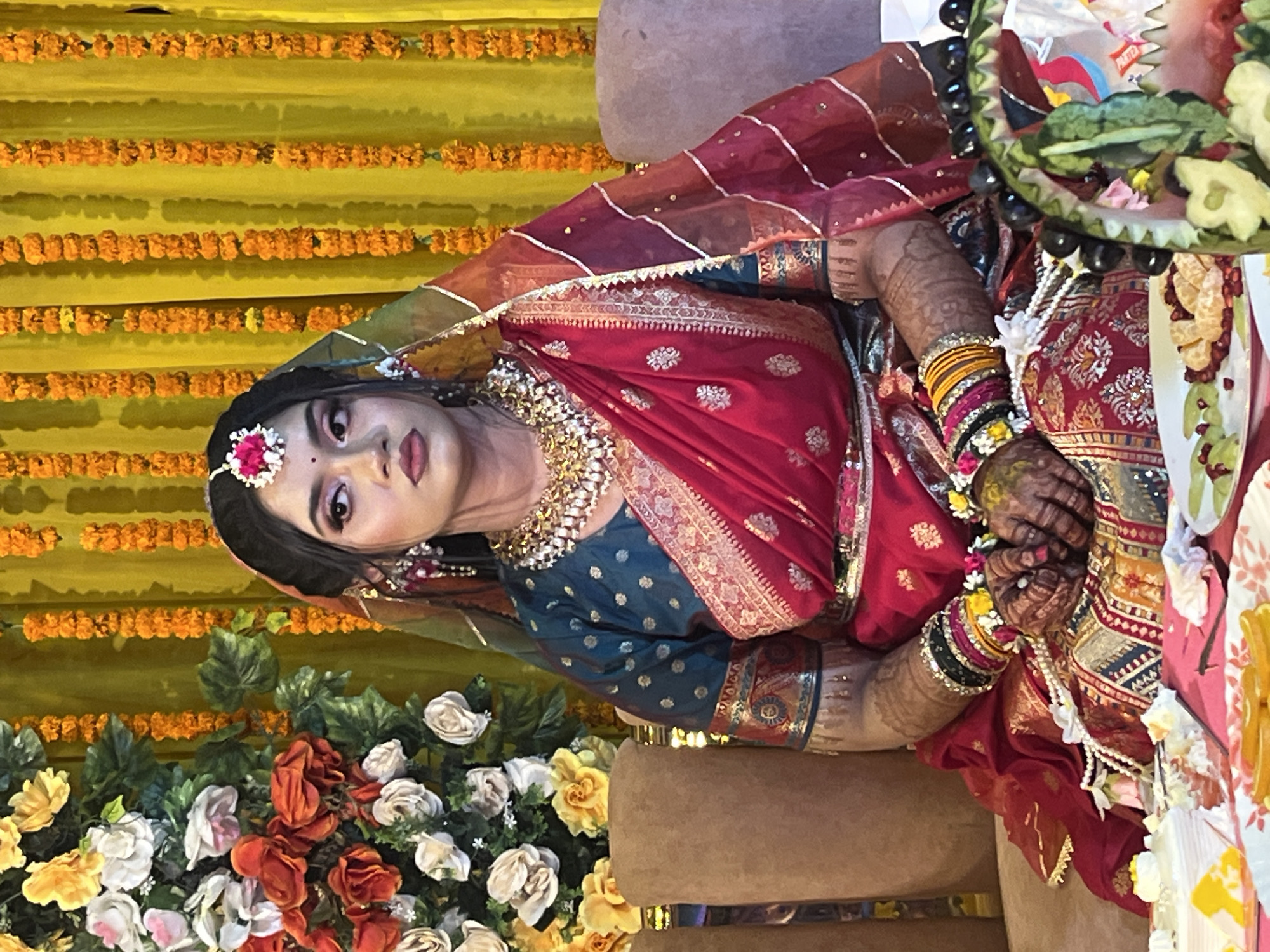 An adult female is depicted seated on a light brown upholstered sofa in Savar, Bangladesh. She is positioned against a yellow fabric backdrop adorned with multiple vertical garlands of orange marigold flowers. To her left, a large floral arrangement featuring white, orange, and yellow roses with green foliage is visible. The woman wears elaborate traditional attire, including a deep red sari or lehenga with extensive gold embroidery and a teal blouse patterned with gold polka dots. A sheer red dupatta with gold trim is draped over her head and shoulders. Her adornments include a large, multi-layered gold and jeweled necklace, matching earrings, and a forehead ornament (maang tikka) with a pink floral accent. Multiple colorful bangles are visible on her wrists, which also display intricate henna designs extending up her forearms. Floral wrist decorations are present on both hands, which are clasped in her lap. Her hair is styled, and her face is made up, with a neutral expression and gaze directed slightly to the viewer's right. In the foreground, a table is positioned in front of the woman, displaying several items. These include plates with sliced oranges or mandarins and scattered pomegranate seeds. An elaborately carved watermelon, possibly in the shape of a basket and filled with grapes and other fruits, is also present. A white cake with yellow accents is visible on a platter to the far left. A string of white pearls or beads lies near her hands.