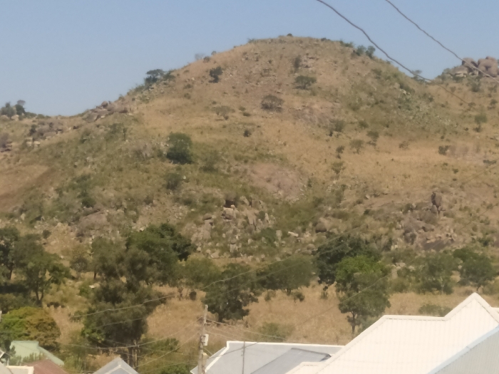 The image displays a daytime outdoor scene featuring a large hill dominating the background under a clear blue sky. The hill's terrain consists of extensive dry, light brown grasses interspersed with numerous grey-brown boulders and rock formations, along with scattered green trees and shrubs. In the immediate foreground, the white, stepped roof of a large structure, consistent with commercial or industrial architecture, is prominent on the right. A reddish-brown roof of another building is partially visible on the lower left. Utility lines, thin and dark, cross diagonally through the upper right portion of the frame. No individuals are present in the scene, and no specific actions or interactions are depicted. The location is the city of Unknown, Unknown.