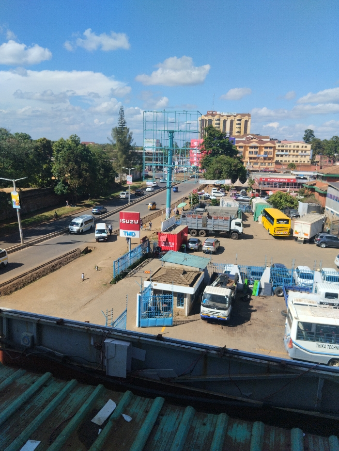 An elevated daytime photograph captures an urban commercial and traffic scene in Thika Township ward, Kenya, under a clear blue sky dotted with scattered white cumulus clouds. In the immediate foreground, a green corrugated metal roof, partially visible with wiring and minor debris, establishes the viewing perspective. Below this, a commercial dirt and gravel yard is enclosed by a blue metal fence with a matching gate and a small guardhouse topped with a brown tiled roof. Within this yard, a white flatbed truck is parked near the guardhouse. To its right, a white bus, partially displaying "THIKA TECHNIC...", is parked alongside blue metal frames, possibly for vehicle components. Further back, a yellow school bus, other large trucks, cars, and a red shipping container are also present. Adjacent to the yard, a multi-lane asphalt road extends horizontally. Vehicular traffic, including white vans, sedans, and a yellow tuk-tuk, is observed moving in both directions. A red "ISUZU TMD" sign stands roadside. Several pedestrians are visible walking near this sign and along the road's edge. A prominent, large, empty blue metal framework for a billboard dominates the central midground above the road. Lush green trees and vegetation line the road's left side. The background features multiple multi-story urban buildings with varying architectural styles, some displaying commercial signage such as "Buffalo Grill." A tall, slender conifer tree stands against the sky in the background. The entire scene is brightly illuminated by natural sunlight.
