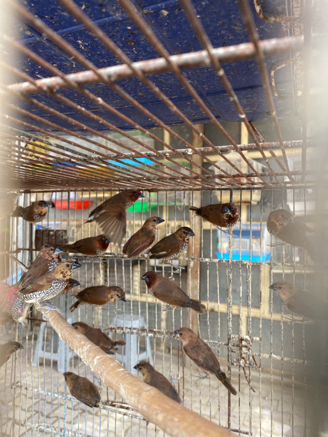 A crowded metal birdcage is depicted from a close, downward perspective, situated within a bird market stall in Kandahar, Afghanistan. Approximately 25-30 small, brown passerine birds, some exhibiting speckled underparts, occupy the cage. Birds are observed perched on rusted horizontal metal bars, the cage floor, and a light-colored wooden dowel positioned in the lower foreground. One bird is captured mid-flap near the upper center. The cage's ceiling features rusted metal bars and a soiled blue plastic panel. The background reveals additional wire cages and structural elements consistent with a market stall. No human figures are visible.
