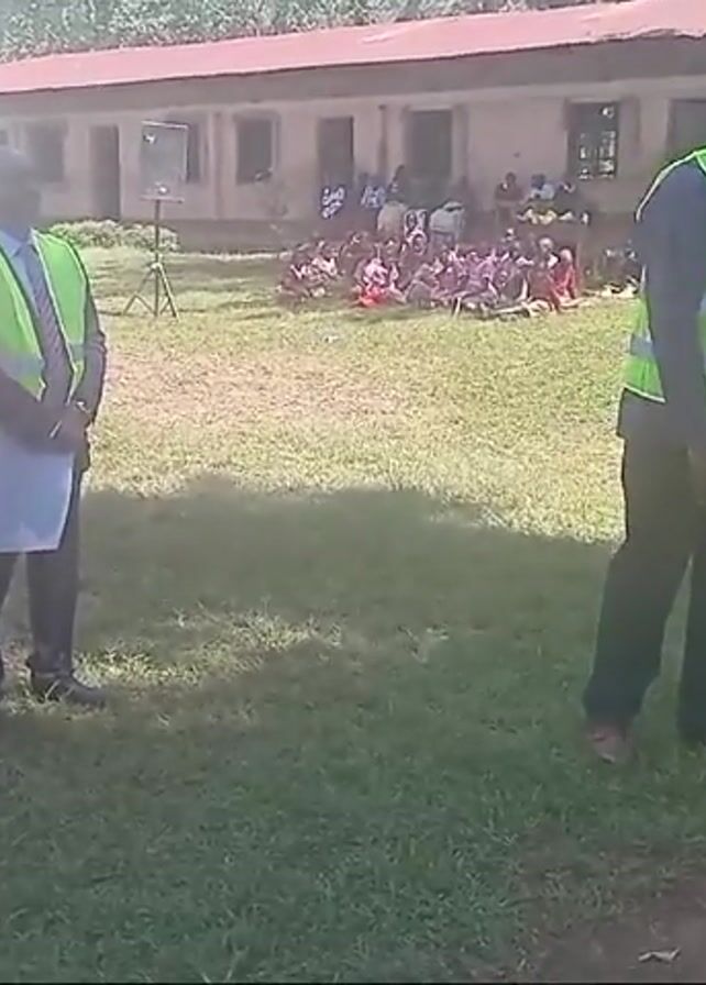 n outdoor gathering. People wearing orange and green vests are standing on the grass. In front of them, people are seated at school desks facing the speakers. They appear to be clapping and cheering. Behind the people are the grounds of a school. A building can be seen with a red roof. The grounds also include some trees and tents. The camera is held by someone in the crowd and filming the scene. The lighting is bright.