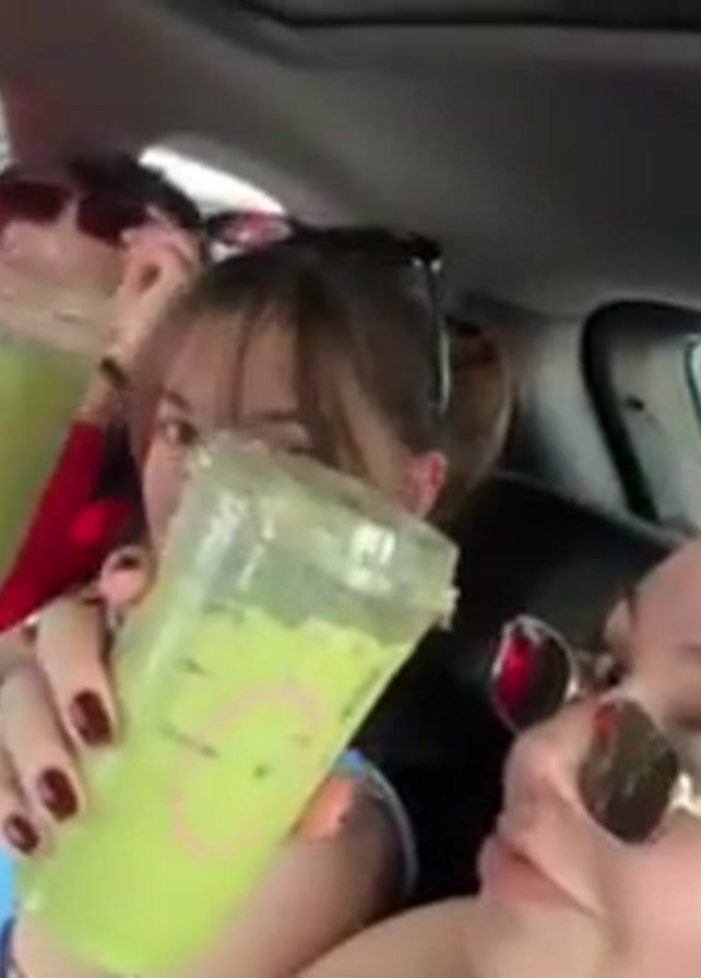 Three young women are in the back seat of a car, each holding a green smoothie or drink. They say "Cheers" and then all drink simultaneously. The woman in the front-right is wearing sunglasses. The woman in the middle is wearing a light blue shirt, and the woman in the back-left is wearing a red shirt and sunglasses. The car has a sunroof. The car appears to be on a city street.