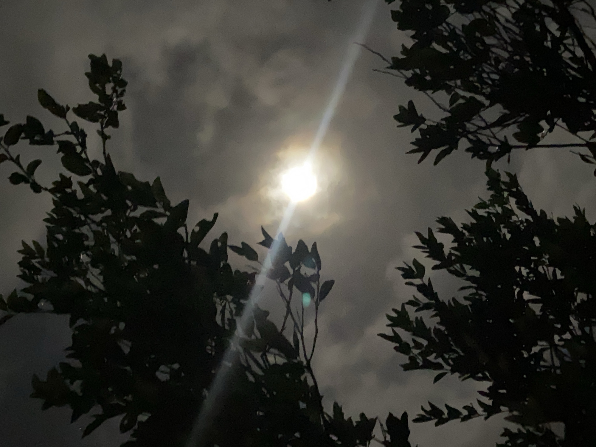 night sky with a bright, partially obscured moon, likely viewed through trees