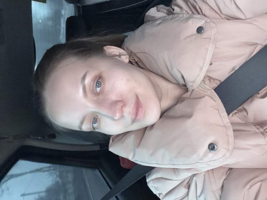 A female individual is depicted seated within a vehicle's passenger compartment, specifically in Spas-Zaulok, Russia. She is secured by a dark-colored seatbelt extending across her chest and left shoulder. The individual has fair skin, light blue-grey eyes, and light brown hair pulled back from her face. She wears a light beige or pale pink quilted puffer jacket, featuring visible metallic snap fasteners on the collar. Small, geometric, possibly gold-toned earrings are present on both ears. Her expression is neutral with a slight upward curve to her lips, and she maintains direct eye contact with the viewer. The vehicle's interior is dark. Through the left-side window, an indistinct exterior environment is visible under dim, overcast lighting, characterized by blurred roadside elements and sparse vegetation. A small, dark hanging ornament is suspended near the upper frame of the left window. A dark headrest is partially discernible behind the individual.