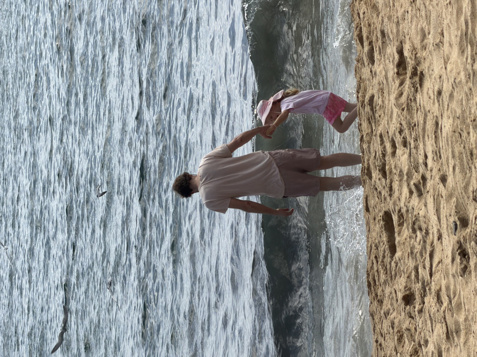 A man holds a young girl's hands and swings her above the water on a beach