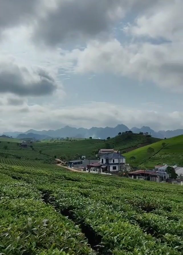 rural landscape, a hillside tea plantation, on an overcast day. The tea plants are densely packed in rows across a hillside. In the middle distance, several houses are scattered around a green hillside. Beyond the houses are a series of ridges and small mountains on the horizon. A person walks through the tea plantation in the foreground. The sky is filled with heavy, grey clouds with patches of lighter sky visible through them.