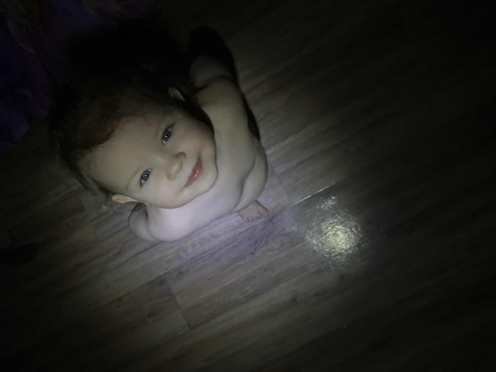 A baby with light skin and blue eyes is sitting on a wooden floor, looking up towards the camera. The room is dimly lit, with a bright spot of light directly in front of the baby. A piece of purple fabric is visible in the upper left corner. The location is Unknown, Unknown.