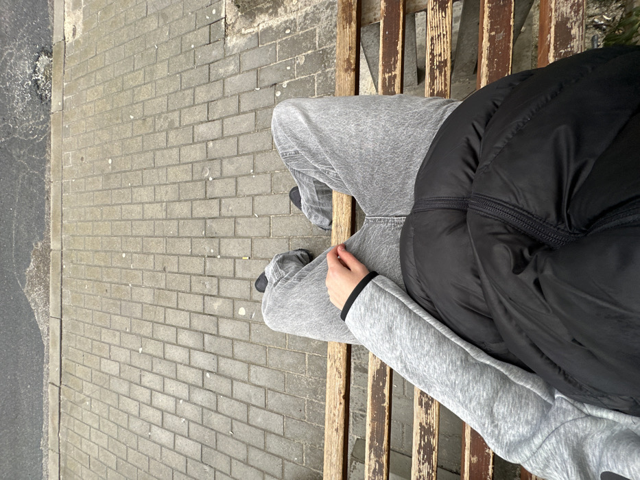 A downward-angle photograph, taken from a seated perspective, depicts a scene in Smolyan, Bulgaria. A person, whose torso and legs are visible, is seated on a weathered wooden bench with peeling paint on its slats. They are dressed in light gray jeans, a gray long-sleeved garment with black cuff trim, and a black puffer jacket partially covering their lap. Their left hand rests on their upper thigh. The foreground features a gray rectangular paver walkway, beyond which lies an asphalt road. Multiple cigarette butts are present on the paved surface.