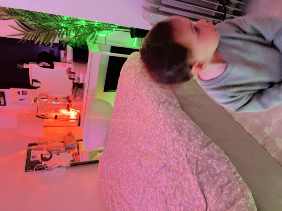 The image depicts an interior room in the city of Kiryat Yam, Israel, characterized by vibrant, multi-colored ambient lighting. A bed occupies the left and central portion of the frame, covered by a light-colored duvet with a subtle floral or leaf pattern, bathed in pink and red light. To the right of the bed, a white dressing table or desk is positioned against the wall. A tall, dark-framed mirror leans against the wall to the left of the desk, from which a white dreamcatcher hangs. The desk surface holds various objects, including cosmetics, small containers, a circular mirror, and a white-shaded table lamp. A white, curved chair is placed in front of the desk. Further to the right, a tall, potted artificial palm-like plant is illuminated by green string lights wrapped around its foliage. A white, finned radiator is partially visible on the far right. In the lower right foreground, a young child, appearing to be a toddler, stands on a light-colored rug. The child has short, dark hair, is wearing a light-colored long-sleeved sweatshirt (light blue or grey), and is facing to the right, looking out of frame. Slight motion blur is present on the child, particularly around the face.