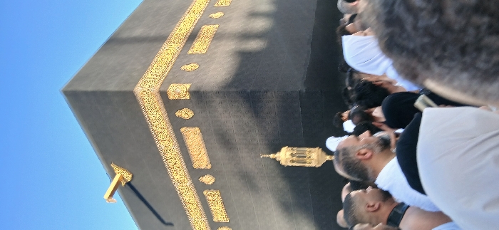 The image depicts a dense gathering of pilgrims in the city of Makkah Al Mukarramah, Saudi Arabia, with the Kaaba prominently featured in the background. The upper half of the frame is dominated by a clear, bright blue sky. The Kaaba, a large, cube-shaped structure, occupies the mid-ground and extends towards the upper left. Its dark, possibly black, surface is adorned with a broad, ornate golden band (Kiswa) that runs horizontally across its walls, featuring intricate Arabic calligraphy and decorative motifs. A golden downspout, the Mizab al-Rahmah, is visible on the upper left corner of the Kaaba. Directly in front of the Kaaba, a golden, elaborately designed lantern is suspended. The lower half of the image is filled with a multitude of individuals, primarily adult pilgrims. Many men are identifiable by their bare shoulders and white Ihram garments. A man with a beard and short dark hair is visible in profile in the mid-left foreground, facing right. Women are also present, some distinguished by white head coverings. The crowd appears to be standing in close proximity, indicating a high volume of people in the area surrounding the Kaaba. Shadows are cast on the Kaaba's wall, suggesting a specific sun angle.