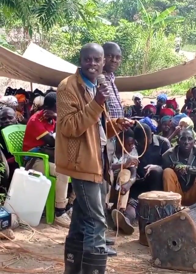 . The video shows a middle-aged man speaking into a microphone outdoors. He is standing in front of a crowd of people seated under a makeshift awning. He is wearing a brown jacket, blue jeans, and tall black rubber boots. The microphone is attached to a cable that is lying on the ground. There is an audio mixer on the ground next to the man. Behind the man, there are two drums, speakers, and a few other people who appear to be part of the event setup. The setting appears to be a rural or semi-rural area with trees and vegetation in the background. The crowd consists of men and women of varying ages. The scene suggests an informal outdoor gathering, possibly a community event or meeting.