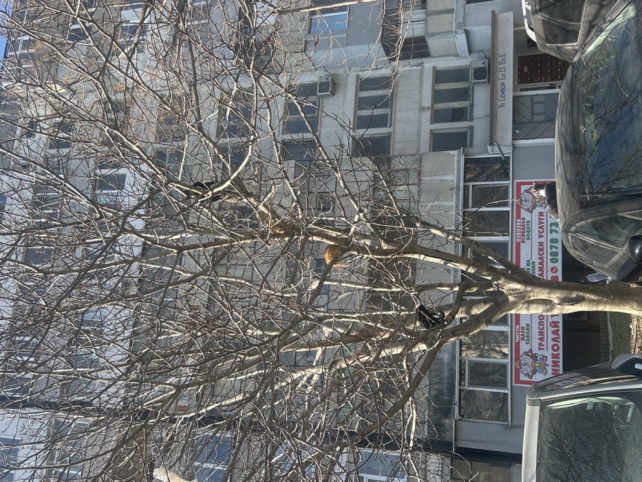 The image depicts an urban street scene in Varna, Bulgaria, specifically at Semyon Bilchev Street 11, Entrance E. A large, bare deciduous tree dominates the central and upper portions of the frame. Five cats are visible: two ginger-colored cats are perched in the tree's branches, one high in the upper-central section and another lower on a left branch. Two black cats are also in the tree, one on a central branch to the right and another partially visible in the upper right. A black and white cat is resting on the roof of a dark-colored sedan parked in the lower right foreground. A light-colored vehicle is partially visible on the far left. In the background, a multi-story, light-grey concrete building rises, featuring numerous windows, some with grates or small balconies, and visible exterior air conditioning units. The ground floor of this building displays a commercial sign with Cyrillic text, partially legible as "ЧИСТИ МАЗИ ТАВАНИ" (Clean Cellars Attics) and "ИЗВОЗВА ВСЯКАКЪВ БОКЛУК" (Hauling All Kinds of Trash), accompanied by a phone number. An entrance door labeled "ВХ. Е" (Entrance E) is situated on the right side of the ground floor. The scene is illuminated by bright daylight, casting visible shadows. No human figures are present.