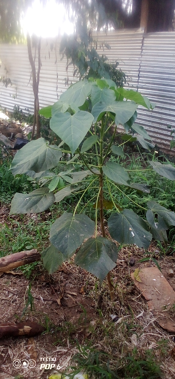 The scene, located in Mahiakalo ward, Kenya, presents an outdoor, eye-level view of a single young plant centrally positioned. The plant features a primary stem from which multiple branches extend, bearing numerous large, dark green, cordate leaves with visible veining and minor surface imperfections. The ground in the foreground consists of reddish-brown soil, interspersed with patches of dry grass and sparse green weeds. A segment of a natural wooden log lies on the ground in the lower-left. In the lower-right, a fragmented piece of a light brown, possibly terracotta or concrete, tile is present. The background includes a horizontally oriented corrugated metallic fence or wall on the right side. Behind and above the main plant, additional green foliage and slender tree trunks are visible. A bright, diffused light source, consistent with sunlight, creates an overexposed area in the upper-center background, filtering through distant leaves. No people, animals, or active interactions are depicted within the frame.