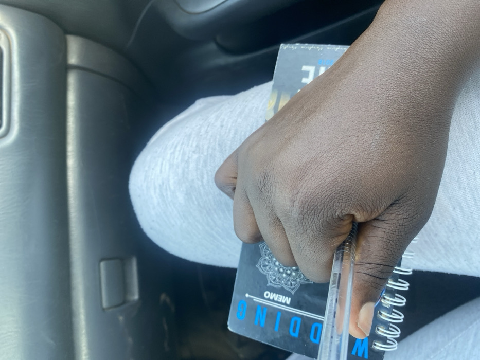 This image depicts a close-up, downward-angled view of a person's left hand and lap inside a vehicle, located in the city of Jos, Nigeria. The dark-skinned hand holds a black, spiral-bound notebook and a transparent ballpoint pen. The notebook cover displays "WEDDING" in vertical blue text on the left, "MEMO" in white text, and a central grey mandala design. The pen is secured within the notebook's clear spiral binding. The person's lap is covered by light grey fabric, consistent with sweatpants. The background reveals a light grey vehicle interior, including a dashboard or glove compartment section with a visible rectangular handle.