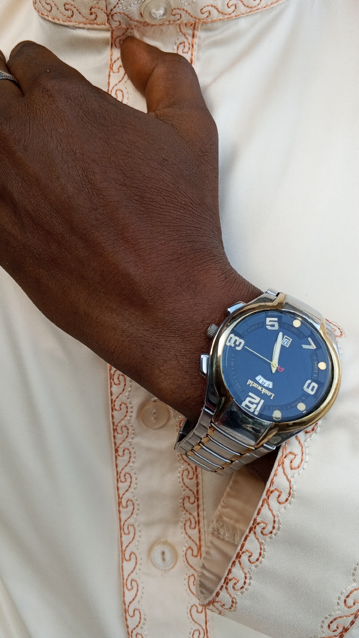 A close-up view depicts the right arm and hand of an individual with dark brown skin, situated in the city of Adankolo, Nigeria. A silver-toned ring is worn on the fourth finger. The individual's forearm is covered by a light cream-colored garment, possibly traditional attire, featuring a placket with three visible light-colored buttons and reddish-brown embroidered wavy patterns along its edge and on the visible cuff. A metallic wristwatch with a silver-toned linked band and a gold-toned bezel is worn on the right wrist, positioned over the cuff. The watch has a dark blue dial with white Arabic numerals at 12, 3, 5, 7, and 9. The brand "Lookworld" and "FRT" are visible on the dial, along with a date window at the 3 o'clock position displaying the number '17'. The minute hand is aligned with the 12 o'clock marker, and the hour hand is positioned just past the 12 o'clock marker. The hand is gently curved, with fingers slightly bent.
