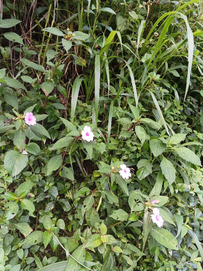 A dense patch of foliage with various shades of green. Several pink and white flowers are dispersed amongst the leaves. Narrow blades of tall green grass intermingle with the broader leaves. The plants exhibit diverse textures and sizes, filling the entire frame, with some leaves showing signs of insect damage.