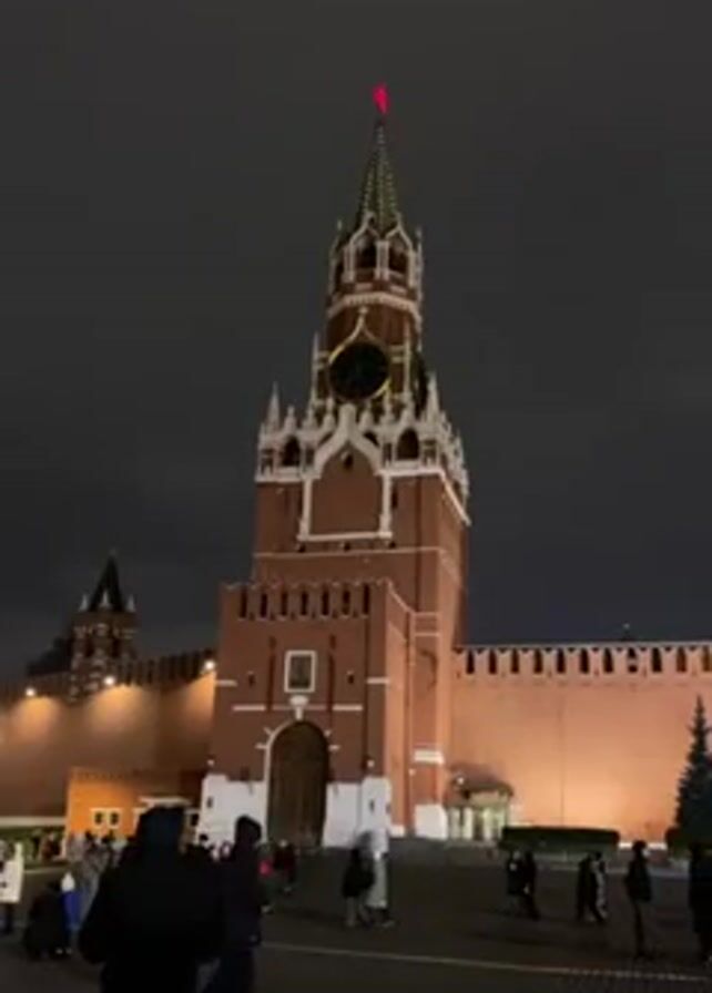 At night, the Spasskaya Tower of the Moscow Kremlin is visible, illuminated with light
