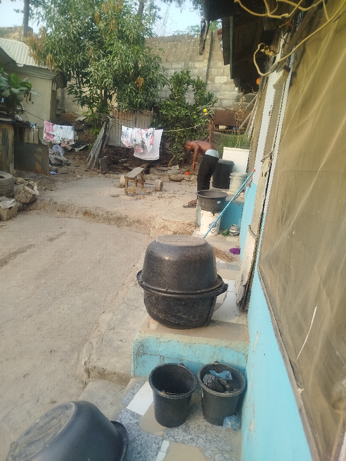 An outdoor scene depicts a residential area with a man, shirtless and wearing dark pants, working in the yard. Laundry hangs on a clothesline in the background. Several black buckets of varying sizes are scattered throughout the foreground and midground. One large bucket sits prominently on a raised step. A building with light blue walls and screened windows is to the right. The yard is uneven, with visible dirt and debris. Trees and a stone wall are in the distance.
