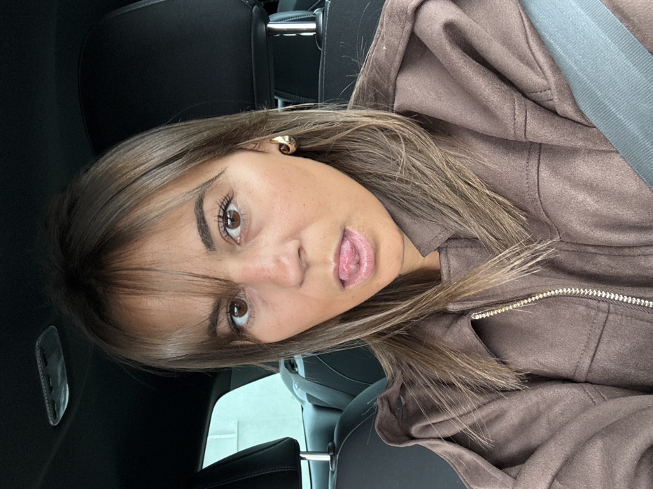 A female individual is depicted seated within a vehicle, identified as being in Andrézieux-Bouthéon, France. The subject, exhibiting a medium-brown hair color with lighter highlights and bangs, has her mouth slightly open with her tongue extended forward. Her brown eyes are directed towards the camera. She is wearing a brown or deep taupe jacket with a front zipper and shoulder epaulets. A gold-colored hoop earring is visible on her right ear. A light blue safety belt is fastened across her chest. The vehicle's interior features dark upholstery, with a headrest visible behind her left shoulder. A light-colored building is discernible through the rear window of the vehicle, indicating an outdoor, daytime environment.