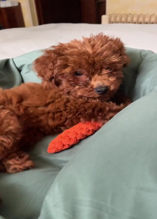 small, red-brown poodle lying on a light green cushion on a bed. The dog is curled up, resting its head on the cushion and cuddling a bright red toy. The bed has a light-colored sheet. In the background, there is a radiator and a doorway. The room appears to be well-lit.