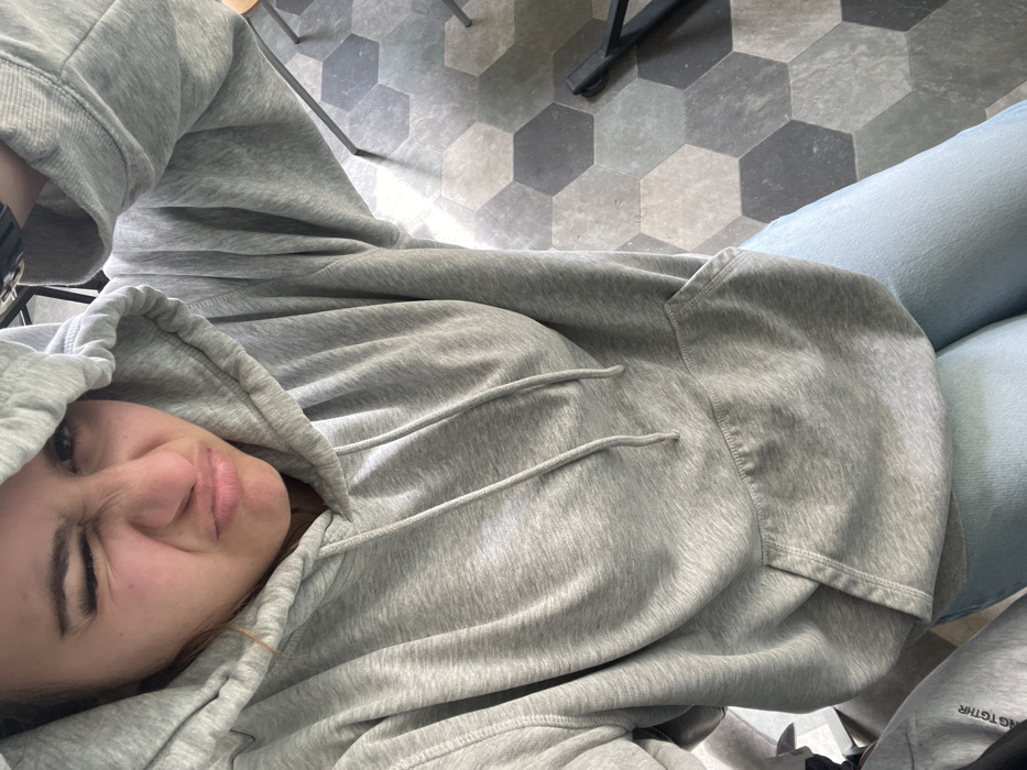 A young female is depicted from an overhead perspective, seated indoors, in Veliko Tarnovo, Bulgaria. She is wearing an oversized light grey hooded sweatshirt with the hood pulled up, partially covering her head, and light blue jeans. Her face displays a playful grimace: her left eye is squinted, her nose is wrinkled, and her lips are pursed. A dark wristband is visible on her left wrist, which is slightly raised. The background features a floor composed of hexagonal tiles in varying shades of grey. Out-of-focus elements in the deeper background include thin, dark metal legs consistent with furniture such as chairs or tables.