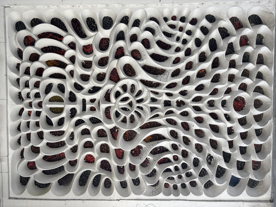 A vertical architectural relief panel is depicted, located in Pazardzhik, Bulgaria. The panel features a three-dimensional abstract design composed of smooth, white, curvilinear forms that create numerous interconnected, deep cavities. Embedded within these cavities are irregularly shaped, translucent fragments, primarily in shades of dark red, black, and occasional amber-yellow. The white sculptural surface shows signs of age and wear. Multiple instances of graffiti are present, with legible words such as "LIFESTYLE," "OK!", and "FREEWHEEL" inscribed in dark markings across various white elements. The overall design exhibits a central vertical axis with recurring organic patterns, including spiral motifs in the lower and upper central regions. The panel is framed by a simple, flat white border.